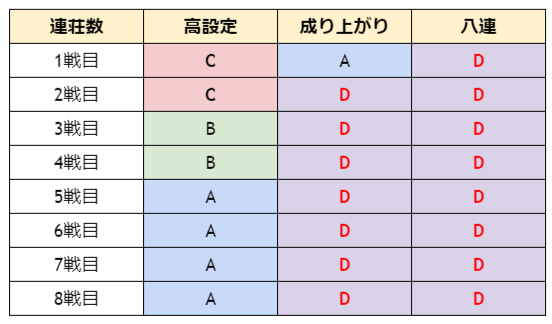 一四七は1,4,7戦目、二五は2戦目と5戦目以降、三六は3戦目と6戦目以降に高ランクが配置されています。一方で高設定シナリオにおいては序盤ほど高ランクが存在し、3連目までは到達しやすく設計されています。また成り上がりは1戦目以外はDランク、八連好機は全てDランクと連荘に期待が持てる仕様と言えます。ランク別の初期ツモ運振分は以下の通りです。