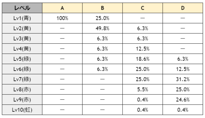 ランク毎に初期ツモ運の振分は異なり、AT継続期待度もランクAにおいては約25%、ランクBは約40%、ランクCは約70%、ランクDは約90%と大きな幅が存在します。